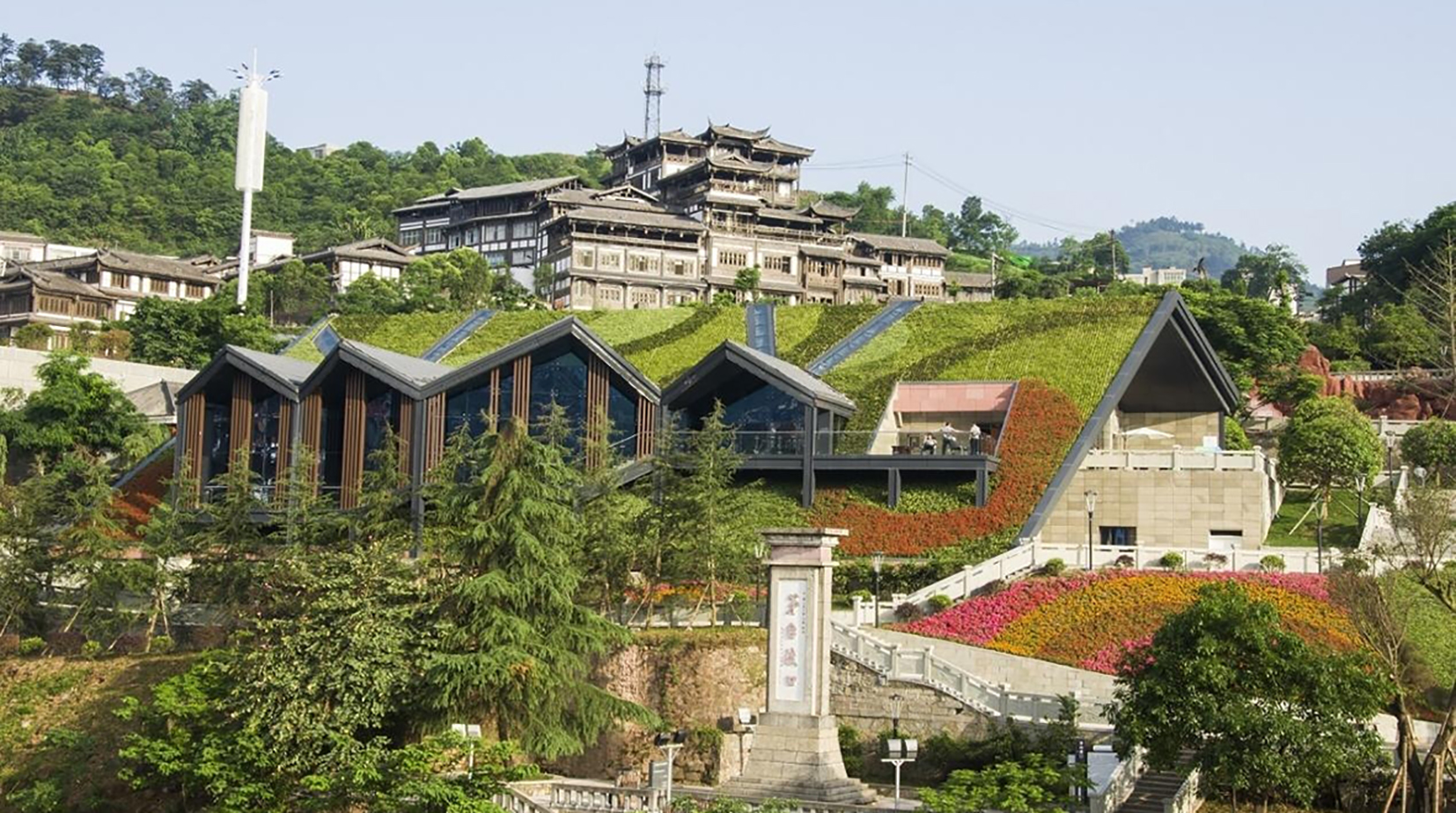 该项目位于贵州茅台镇,包含屋顶、墙面、边坡三种类型场地,其中边坡坡度均在60度以上。绿化改善前项目整体的绿化效果差、观赏效果不佳,未体现当地特色文化。公司从前期的项目投入成本及后期养护管理综合考虑,利用铺贴式立体绿化技术打造特色化的茅台镇。