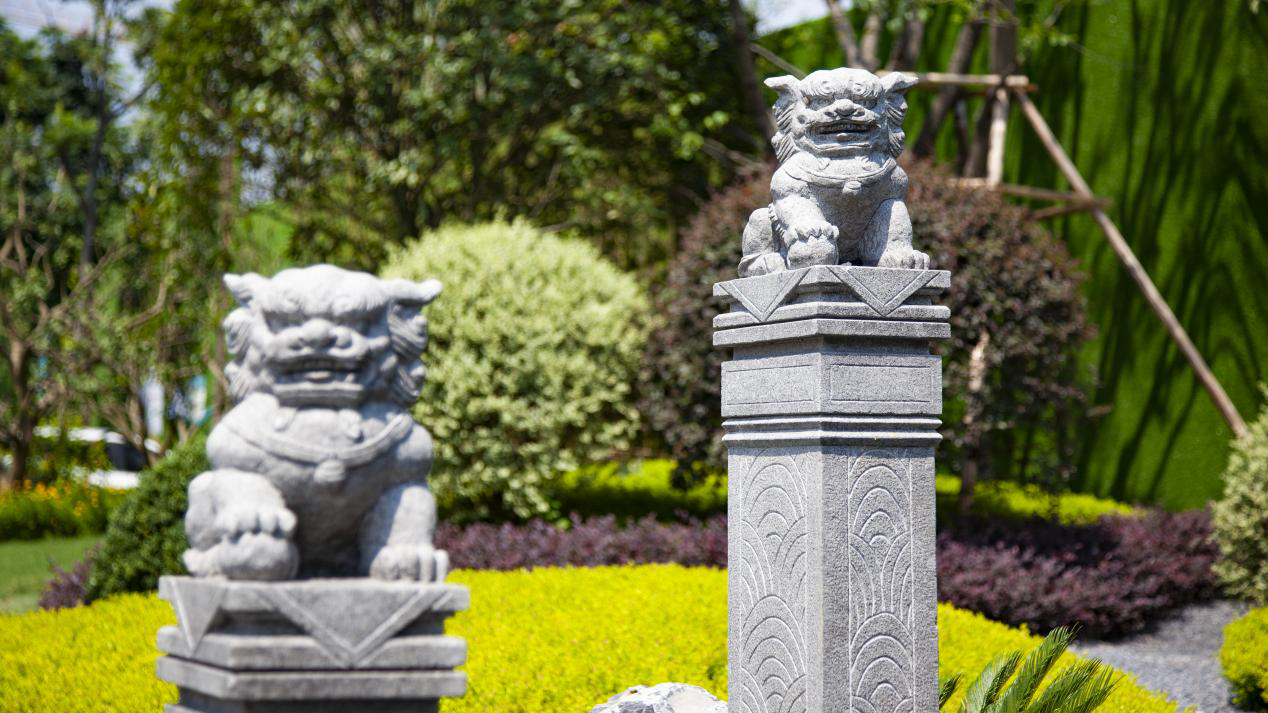 廊旁石狮伫立守护,廊边天然山石错落有致